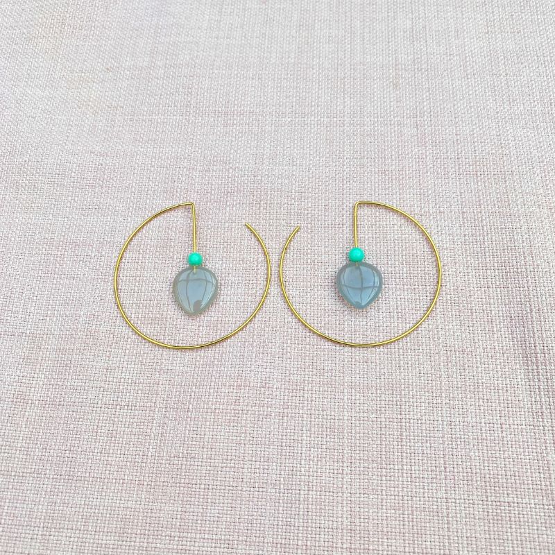 Små cirkel øreringe i forgyldt sølv med blålilla agat og grøn crysophras. Stenenes farve kombination giver disse øreringe et boheme udtryk og leder tankerne mod sydligere himmelstrøg.