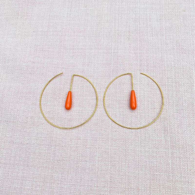 Cirkel øreringe i forgyldt sølv, med orange koral er smukke og visuelt store. Øreringene der tages på fra bagsiden af øreflippen og drejes hele vejen rundt. De vejer ikke meget, skønt de ser ud af meget.