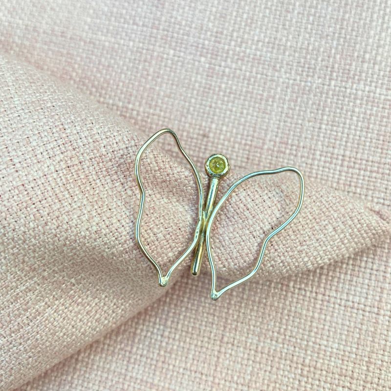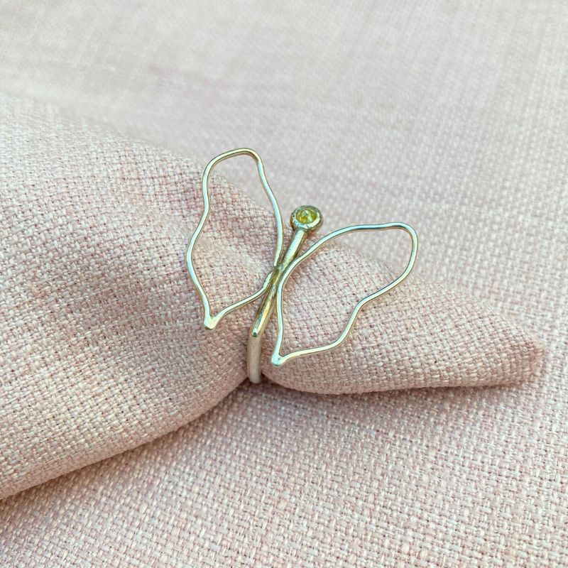 Poetisk diamant sommerfugl ring i sølv. Sommerfuglens hoved er en 3mm rosenslebet gul diamant. Ringen er åben og det er derfor muligt at justere størrelsen. En rigtig gå i byen ring, som du ikke ser andre med.