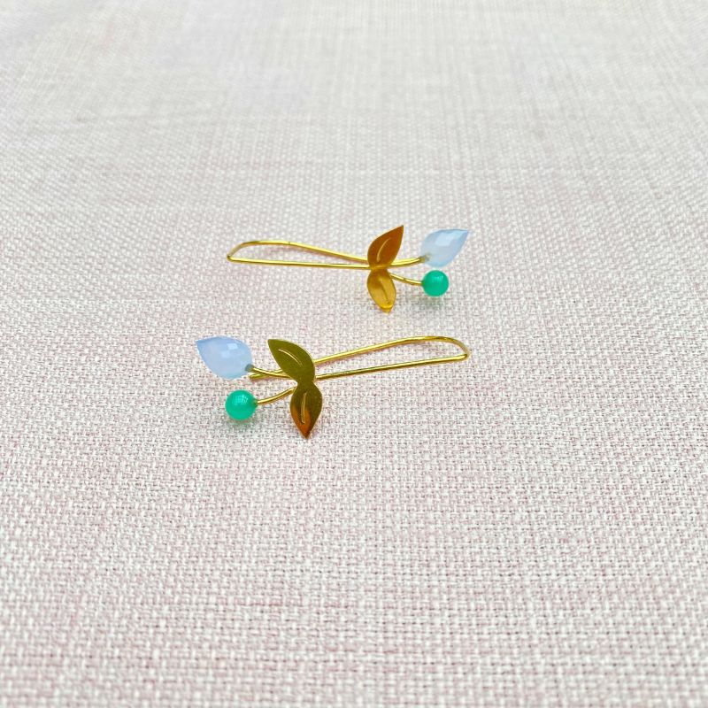 Smukke candybær øreringe i forgyldt sølv, med lyseblå chalcedon og grøn crysophars. Farve kombinationen på disse øreringe er meget i øjenfaldende og lækker. Ren forkælelse til dine øre.