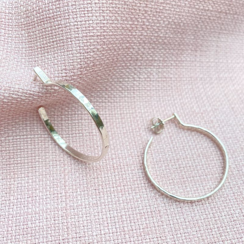 Sølv creoler er runde øreringe der sættes fast med en ørestik. Overfladen har en let struktur der gør at lyset fanges af dem.