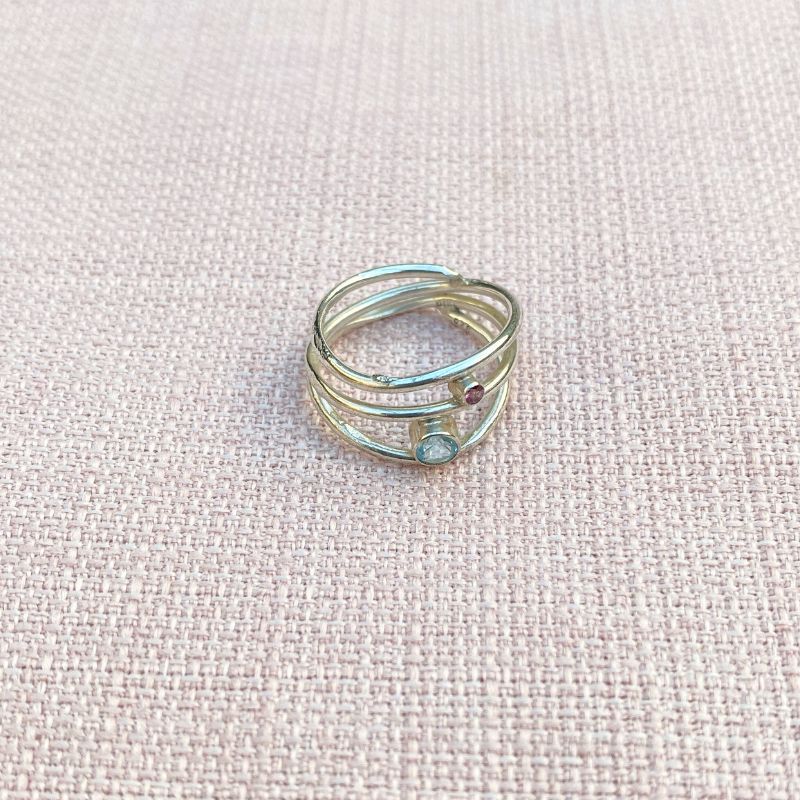 Delikat sølvring med indfattet lyseblå topas og pink turmalin. En super anvendelig ring der passer til det meste og ikke kommer vejen for dine aktiviteter.