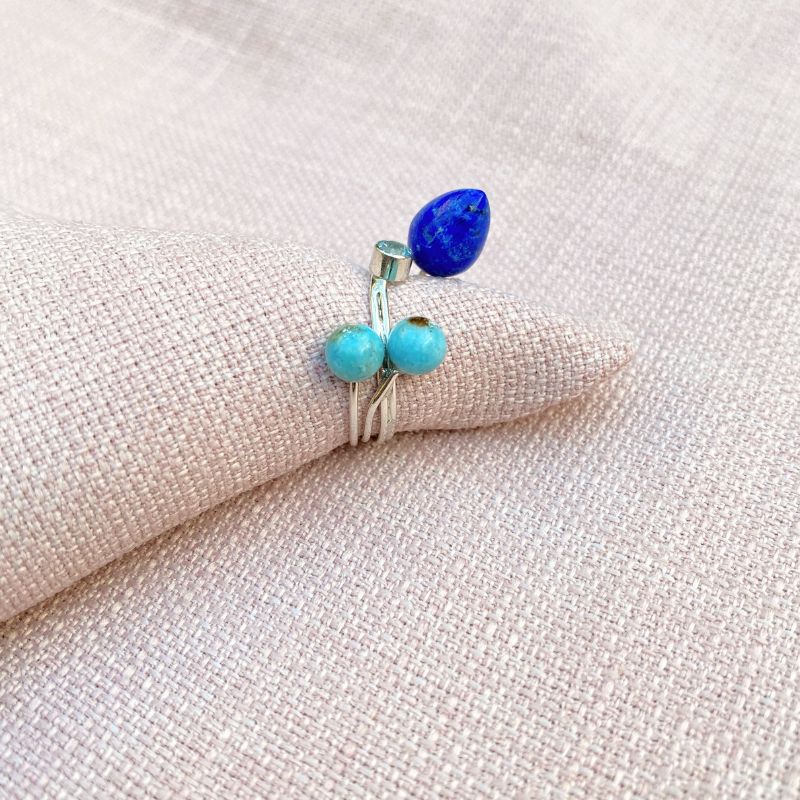 Unika Buketring i sølv med blomsterhoveder af lapis lazuli, indfattet lyseblå topas og blå opal perler. En festlig og farvestrålende ring der kan pifte et hvert outfit op.