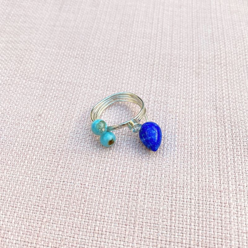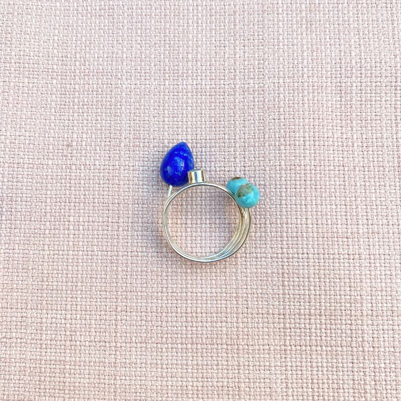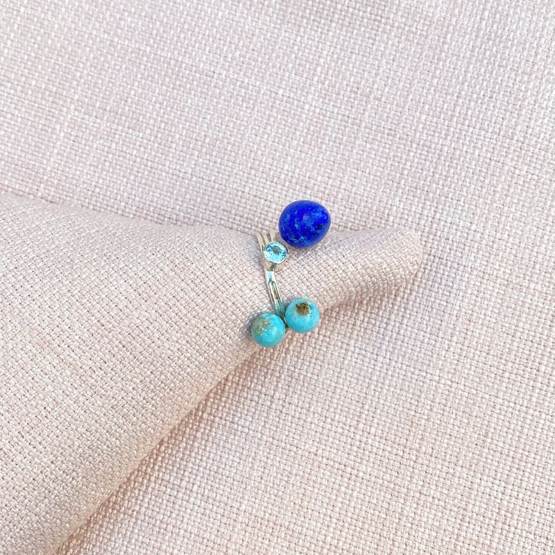 Unika sølvring med mørkeblå lapis lazuli, indfattet lyseblå topas og to blå opal perler.