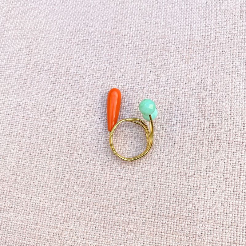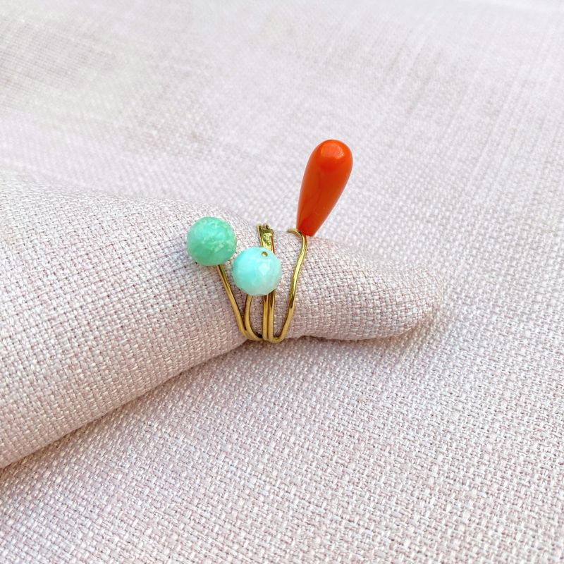 Skøn unika Buketring i forgyldt sølv med blomsterhoveder af orange koral og grønne crysophras perler. En ring der tiltrækker sig opmærksomhed hvor den kommer frem. Uundværlig til en festlig aften.